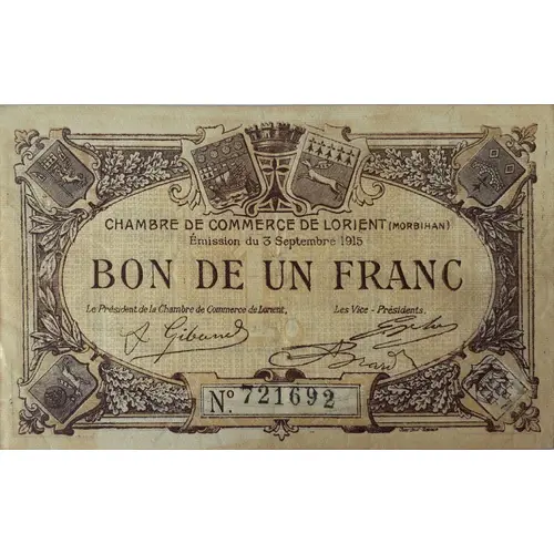 CHAMBRE DE COMMERCE DE LORIENT (MORBIHAN) EMISSION DU [...] BON DE UN FRANC Le Président de la Chambre de Commerce de Lorient Les Vices-Présidents OBERTHUR - RENNES |