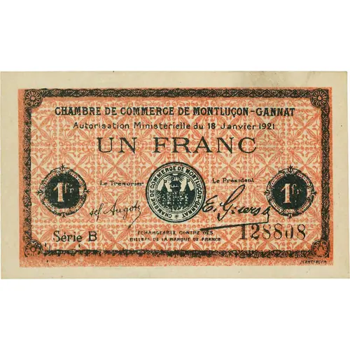 | Obverse lettering | CHAMBRE DE COMMERCE DE MONTLUCON-GANNAT Autorisation Ministérielle du 18 janvier 1921 Le Trésorier Le Président Série B 128808 Échangeable contre des billets de la Banque de France HERBIN & BOUCHÉ MONTLUÇON |