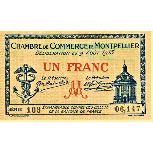 | Obverse lettering | CHAMBRE DE COMMERCE DE MONTPELLIER Délibération du 9 août 1915 UN FRANC Le Trésorier Le Président Série 103 06,147 P. ARNAVIELME INV IMP RICHARD |