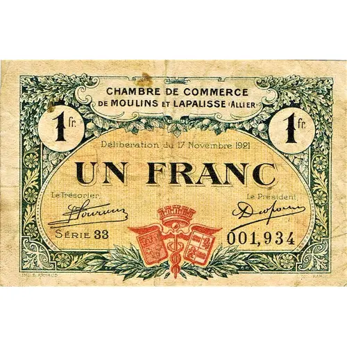 | Obverse lettering | CHAMBRE DE COMMERCE DE MOULINS ET LAPALISSE (Allier) Délibération du 17 novembre 1921 UN FRANC Le Trésorier Le Président Série 33 001,934 IMP. B.ARNAUD LYON-PARIS |