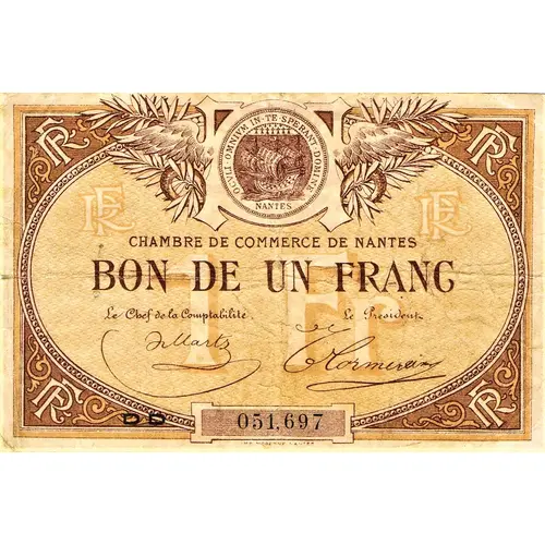 Obverse lettering CHAMBRE DE COMMERCE DE NANTES BON DE UN FRANC Le Chef de la Comptabilité Le Trésorier DD 051,697 IMP MODERNE NANTES