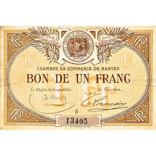 | Obverse lettering | CHAMBRE DE COMMERCE DE NANTES BON DE UN FRANC Le Chef de la Comptabilité Le Trésorier S 13405 IMP. MODERNE NANTES |