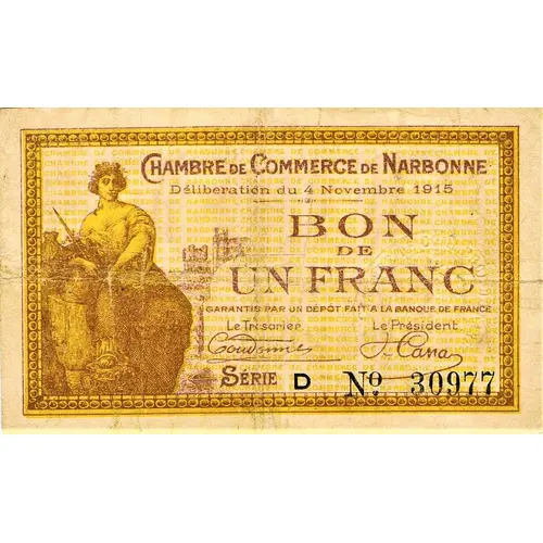 | Obverse lettering | CHAMBRE DE COMMERCE DE NARBONNE Délibération du 4 novembre 1915 BON DE UN FRANC Garanti par un dépôt à la Banque de France Le Trésorier Le Président Série D N° 30977 |