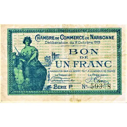 | Obverse lettering | CHAMBRE DE COMMERCE DE NARBONNE Délibération du 2 octobre 1919 BON DE UN FRANC Garantis par un dépôt fait à la Banque de France Le Trésorier Le Président Série P N° 50358 |