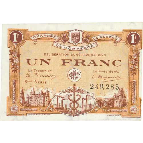正面铭文 1. F | 1. F CHAMBRE DE COMMERCE DE NEVERS DELIBERATION DU 22 Février 1920 UN FRANC SERIE FORTIN & Co NEVERS - PARIS H. BALON DEL LTH