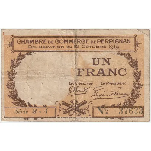 | Obverse lettering | CHAMBRE DE COMMERCE DE PERPIGNAN DÉLIBÉRATION DU 22 OCTOBRE 1919 UN FRANC IMP. P. MORER - BENEZET - PERPIGNAN |