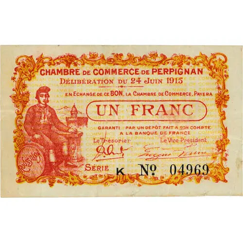 | Obverse lettering | CHAMBRE DE COMMERCE DE PERPIGNAN DÉLIBÉRATION DU 24 juin 1915 En échange de ce BON, la Chambre de Commerce, payera UN FRANC Garanti par un dépôt fait à son compte à la Banque de France Le Trésorier Le Vice-Président Série K N°04969 |