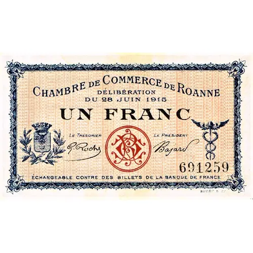 | Obverse lettering | CHAMBRE DE COMMERCE DE ROANNE Délibération du 28 juin 1915 UN FRANC Le Trésorier Le Président 691259 Échangeable contre des billets de la Banque de France BOURG & Cie |
