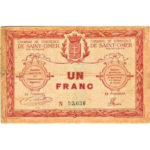 | Obverse lettering | CHAMBRE DE COMMERCE DE SAINT-OMER UN FRANC Le Trésorier Le Président N 52,636 IMP RICHARD PARIS |