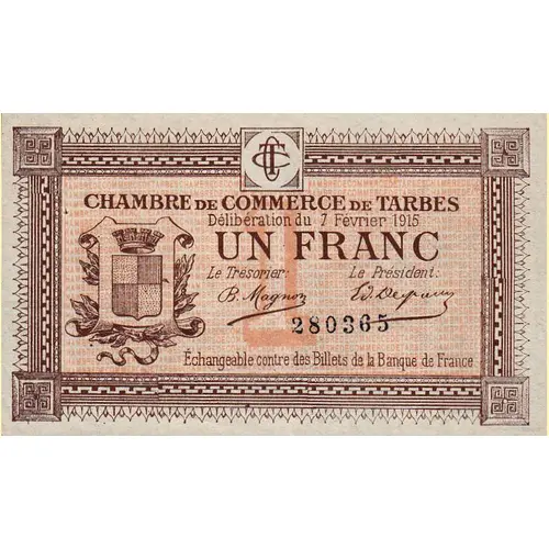 | Obverse description | Chamber of Commerce of Tarbes 1 franc Date of deliberation : February 7, 1915 Repayment deadline: February 7, 1920 Printed by : L. CASSAN AINÉ - TOULOUSE Without series Number of the black bill with 6 digits Signatures : The Treasurer - The President Without watermark |