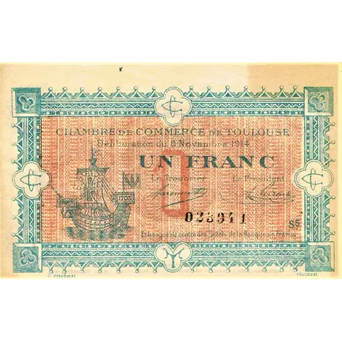 CHAMBRE DE COMMERCE DE TOULOUSE Délibération du 6 Novembre 1914 UN FRANC Le Trésorier Le Président 023941 S5 Échangeable contre des Billets de la Banque de France C. BERDOULAT - TOULOUSE |