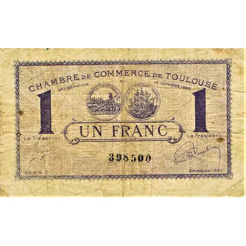 | Obverse lettering | CHAMBRE DE COMMERCE DE TOULOUSE Délibération du 13 octobre 1920 UN FRANC 398500 Série 1 Emission 1921 |
