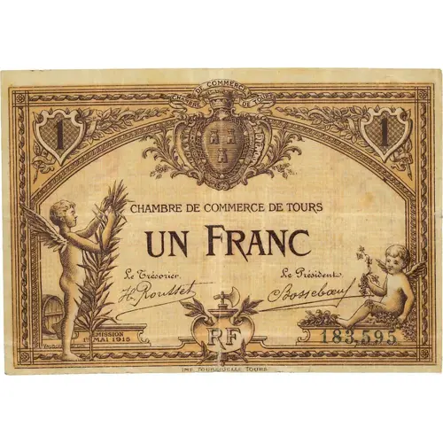 UN FRANC Le Trésorier Le Président CHAMBRE DE COMMERCE DE TOURS Emission 1er Mai 1915 183,595 VAUDOU Gr. Lith. SAUROY inv. et del. IMP TOURANGELLE TOURS |