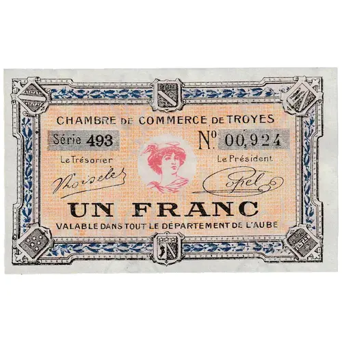 | Obverse lettering | CHAMBRE DE COMMERCE DE TROYES Série 527 Nº13,934 Le Trésorier Le Président UN FRANC VALABLE DANS TOUT LE DÉPARTEMENT DE L`AUBE (Translation: CHAMBER OF COMMERCE OF TROYES Series ___ No. ___ The Treasurer The President ONE FRANC VALID THROUGHOUT THE AUBE DEPARTMENT) |