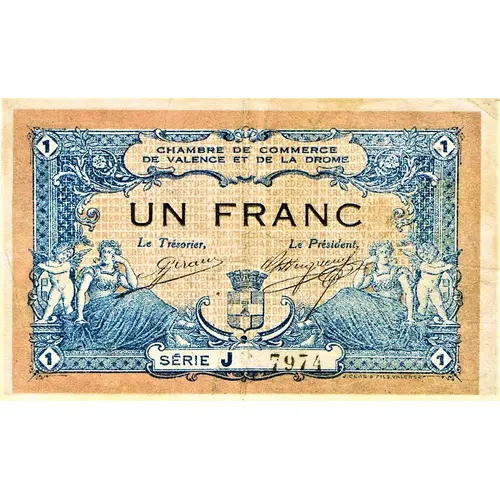 | Obverse lettering | CHAMBRE DE COMMERCE DE VALENCE ET DE LA DRÔME UN FRANC Le Trésorier Le Président Série J 7974 J. CEAS & FILS VALENCE |