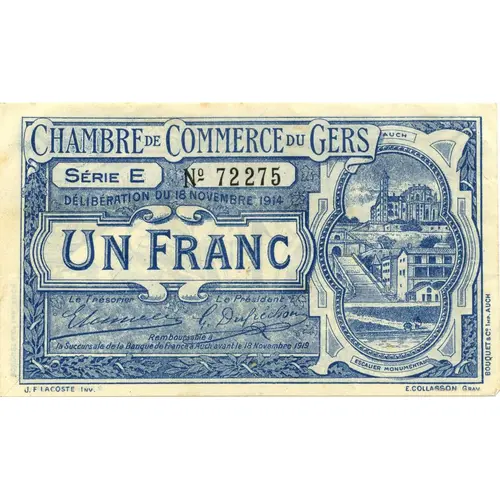 CHAMBRE DE COMMERCE DU GERS SERIE E | N° 72275 DELIBERATION DU 18 NOVEMBRE 1914 UN FRANC Le Trésorier Le Président Remboursable à la succursale de la Banque de france avant le 18 novembre 1919 J.E.LACOSTE Inv. | E.COLLASSON. Grav. | BOUQUET & Co Imp AUCH. |