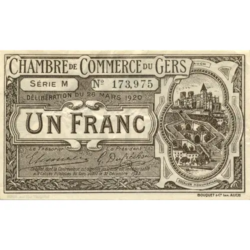 CHAMBRE DE COMMERCE DU GERS SERIE M | N°173,975 DELIBERATION DU 26 MARS 1920 UN FRANC Le Trésorier Le Président Ce billet dont la Contrevaleur est déposée au Trésor est remboursable aux Caisses Publiques du Gers avant le 31 décembre 1925. BOUQUET & Co Imp AUCH. |