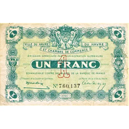 | Obverse lettering | VILLE DU HAVRE ET CHAMBRE DE COMMERCE DU HAVRE Emission approuvée par l`Administration Supérieure UN FRANC Echangeable contre des billets de la Banque de France Le Président de la Chambre de Commerce Le Maire de la Ville du Havre N° 760,137 1920 |