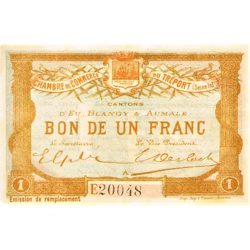 | Obverse lettering | CHAMBRE DE COMMERCE DU TREPORT (Seine Inf) CANTONS D`EU , BLANGY & AUMALE BON DE UN FRANC Le Secrétaire Le Vice-Président A E 20048 Imp. Roy & Valade, Amiens |