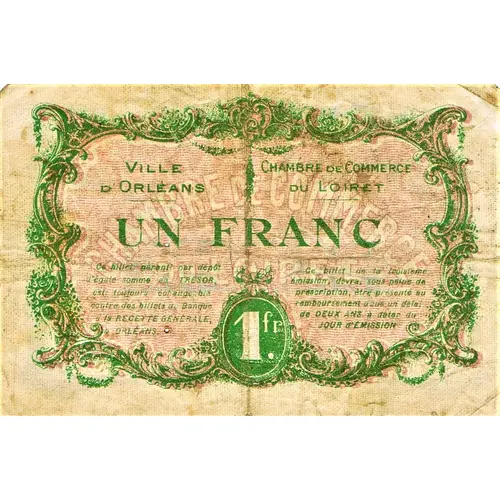 | Obverse lettering | 1917 CHAMBRE DE COMMERCE ET VILLE D`ORLEANS 3° EMISSION N° 359 776 un franc VILLE D`ORLEANS 2 août 1917 Imp. Aug. GOUT & Cie ORLEANS |