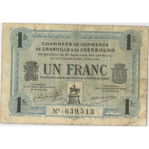 | Obverse lettering | CHAMBRES DE COMMERCE DE GRANVILLE & DE CHERBOURG Délibération du 27 Septembre 1921 (Cherbourg) et du 7 Octobre 1921 (Granville) UN FRANC Echangeable contre des billets de la Banque de France Le Président de la Chambre de Commerce de Granville Le Président de la Chambre de Commerce de Cherbourg N° 639,513 IMP B.ARNAUD LYON-PARIS |