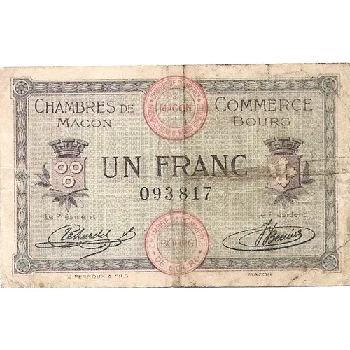 | Obverse lettering | CHAMBRE DE | COMMERCE DE MACON | BOURG UN FRANC Le Président | Le Président X. PERROUX & FILS MACON |
