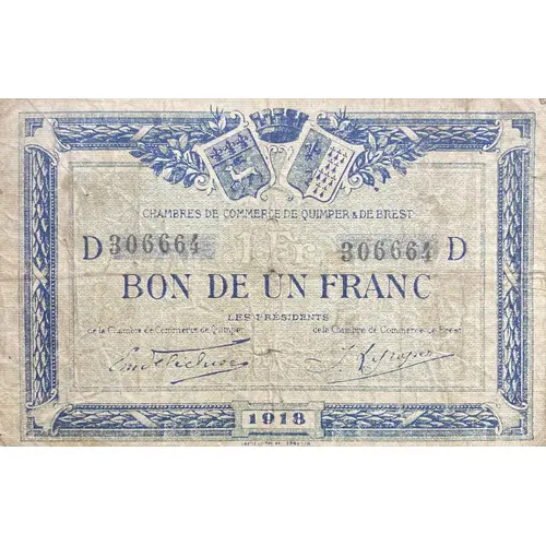 | Obverse lettering | CHAMBRES DE COMMERCE DE QUIMPER & DE BREST BON DE UN FRANC LES PRESIDENTS de la Chambre de Commerce de Quimper de la Chambre de Commerce de Brest 1918 Oberthür - Rennes (2006 - 15) |