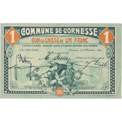 COMMUNE DE CORNESSE 1 1 BON DE CAISSE DE UN FRANC remboursable aussitôt que la situation normale soit rétablie Cornesse le 31 Octobre 1915 LE COLLÈGE : Le Bourgmestre ff L`Echevin des Finances ff Le Secrétaire : (trois signatures) VOIR AU VERSO LE CARACTERE D`AUTHENCITE 1915 L J. CROUQUET & FILS. VERVIERS. |