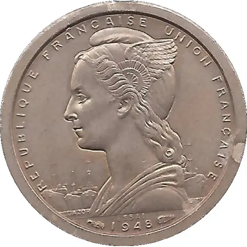 Obverse lettering REPUBLIQUE FRANÇAISE UNION FRANÇAISE L.BAZOR GB· ESSAI 1948