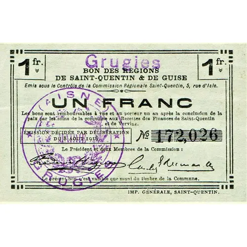 | Ön yüz lejandı | 1 Fr GRUGIES 1 Fr Bon des régions de Saint-Quentin & de Guise UN FRANC Émission décidée par délibération du 8 août 1916 N° 172,026 Le Président et deux membres de la Commission Le présent bon n`est valable que muni du timbre de la Commune. IMP. GÉNÉRALE, SAINT-QUENTIN. |