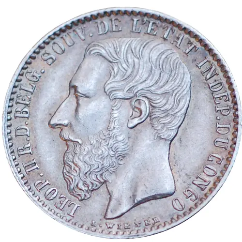 Obverse lettering LEOP. II R. D. BELG. SOUV. DE L`ETAT INDEP. DU CONGO L. WIENER