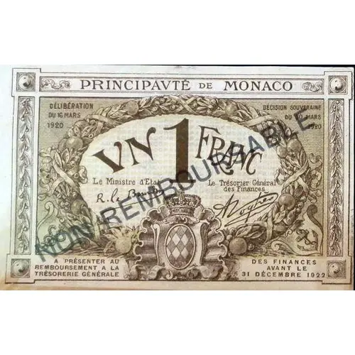 PRINCIPAUTÉ DE MONACO Délibération du 16 mars 1920 Décision souveraine du 20 mars 1920 UN 1 FRANC Le Ministre d’Etat R. le Bourdon Le Trésorier Général des Finances A.Noghès A PRÉSENTER AU REMBOURSEMENT A LA TRESORERIE GENERALE DES FINANCES AVANT LE 31 DÉCEMBRE 1922 NON REMBOURSABLE (en travers) |
