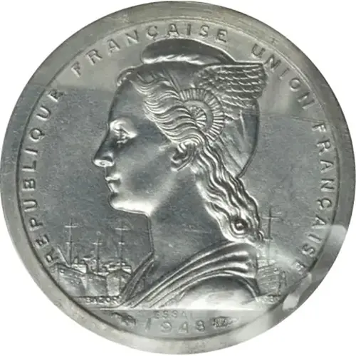Obverse lettering REPUBLIQUE FRANÇAISE UNION FRANÇAISE L.BAZOR G.B. ESSAI 1948