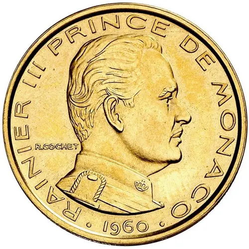 | Obverse lettering | RAINIER III PRINCE DE MONACO R.COCHET · 1960 · (Translation: Rainier III, Prince of Monaco) |