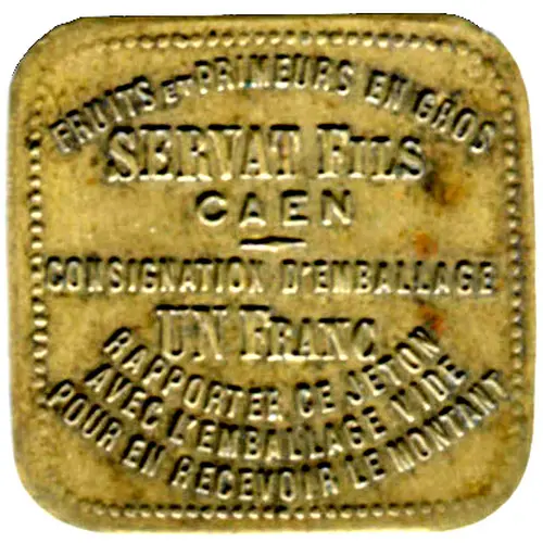 | Obverse lettering | Fruits et Primeurs en gros SERVAT Fils Caen Consignation d`emballage Un Franc Rapporter ce jeton avec l`emballage vide pour en recevoir le montant |