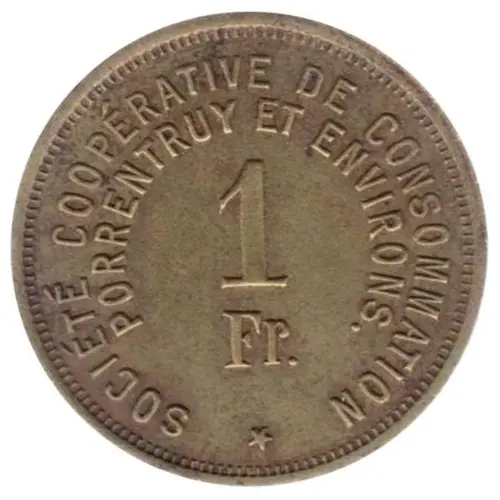 | Obverse lettering | SOCIÉTÉ COOPÉRATIVE DE CONSOMMATION PORRENTRUY ET ENVIRONS. 1 Fr. (Translation: Consumer Cooperative Society of Porrentruy and surroundings.) |
