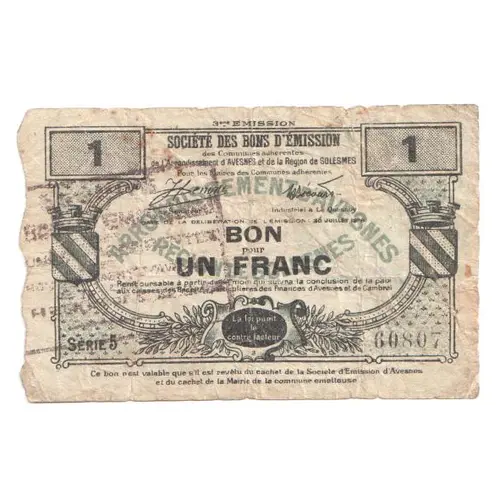 | Obverse lettering | 3ème EMISSION SOCIETE DES BONS D`EMISSION des Communes adhérents de l`Arrondissement d`AVESNES et de la Région de SOLEMES Date de la délibération de l`émission : 30 juillet 1916 BON pour UN FRANC Série 5 60807 Ce bon n`est valable que s`il est revêtu du cachet de la Société d`émission d`Avernes et du cachet de la Mairie de la commune émetteuse |