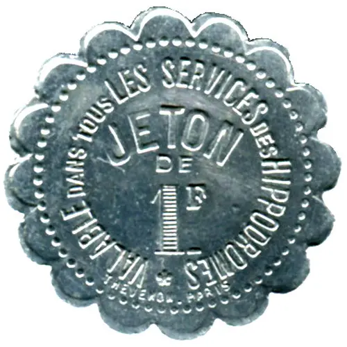 | نوشتههای روی توکن | Valable dans tous les services des hippodromes Jeton de 1 F Thevenon.Paris |