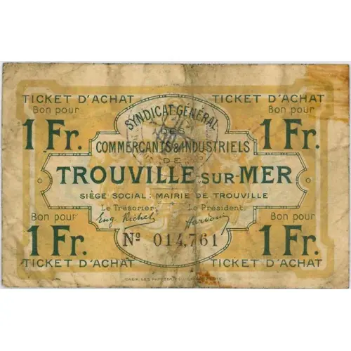 | Obverse lettering | SYNDICAT GENERAL DES COMMERCANTS & INDUSTRIELS CHAMBRE DE COMMERCE DE TROUVILLE-SUR-MER SIÈGE SOCIAL MAIRIE DE TROUVILLE Le Trésorier Le Président N° 014,761 CAEN, LES PAPETERIES DE NORMANDIE |