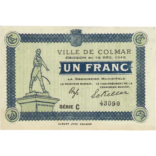 | Obverse lettering | VILLE DE COLMAR UN FRANC EMISSION DU 15 DEC.1918 LA COMMISSION MUNICIPALE LE RECECEVEUR MUNICIP. LE V-PRESIDENT DE LA COMMISSION MUNICIP. SERIE C 43090 ALBERT JESS COLMAR |