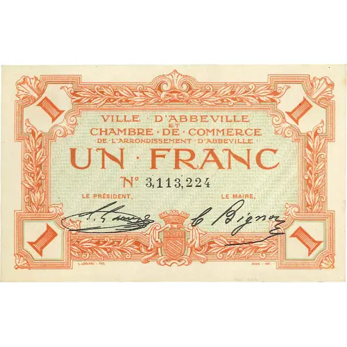 1 | 1 VILLE D`ABBEVILLE ET CHAMBRE DE COMMERCE DE L`ARRONDISSEMENT D`ABBEVILLE UN FRANC N° 3,113,224 Le Président Le Maire 1 | 1 L.LECLERC FEC CHAIX - IMP |