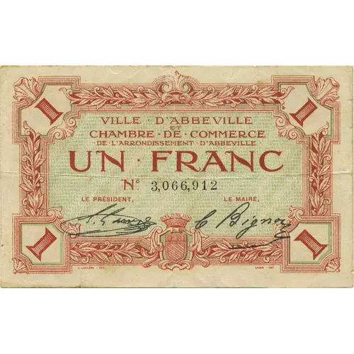 1 | 1 VILLE D`ABBEVILLE ET CHAMBRE DE COMMERCE DE L`ARRONDISSEMENT D`ABBEVILLE UN FRANC N° 3,066,912 Le Président Le Maire 1 | 1 L.LECLERC FEC CHAIX - IMP |