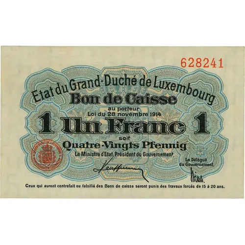 Etat du Grand-Duché de Luxembourg Bon de Caisse au porteur Loi du 28 novembre 1914 1 Un Franc 1 soit Quatre-Vingts Pfennig Le Ministre d`Etat, President du Gouvernement. Le Délégue du Gouvernment Ceux qui auront contrefait ou falsifié des Bons de caisse seront punis des travaux forcés de 15 à 20 ans. (Translation: State of the Grand Duchy of Luxembourg Cash Voucher To bearer Law of November 28, 1914 One Francs or Eighty Pfennig. The Director-General of Finances / The Government Delegate Those who have counterfeited or falsified Cash Vouchers will be punished with forced labor for 15 to 20 years.) |