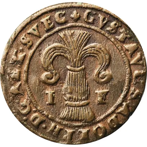 | Obverse description | Wheat sheaf, symbol of the House of Vasa, divides value at sides within a beaded circle. Legend outside. |