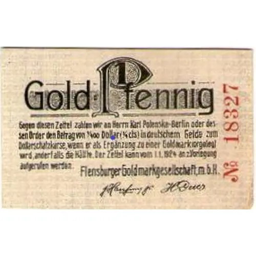 Obverse lettering 1 Gold Pfennig Gegen diesen Zettel zahlen wir an Herrn Karl Polenske-Berlin oder dessen Order den Betrag von 1/400 Dollar (1/4 cls) in deutschem Geld zumDollarschatzkurse, wenn er als Ergänzung zu einer Goldmark vorgelegt wird, anderfalls dir Hälfte. Der Zettel kann vom 1.1,1924 anz.Vorlegung anfgerufen werden. Flensburger Goldmarkgesellschaft. m.b.H