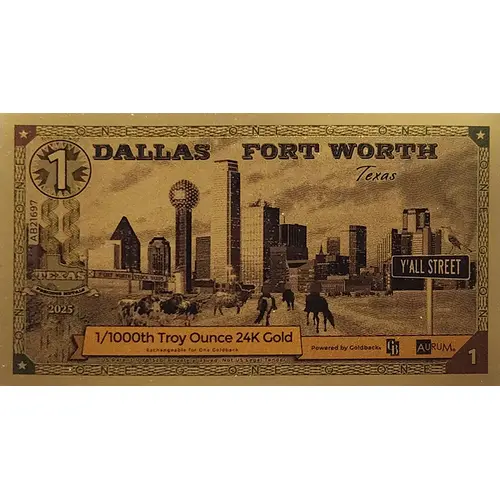 | Légende de l’avers | 1 DALLAS - FORT WORTH Texas AB21697 TEXAS PRECIOUS METALS 2025 ONE GOLDBACK Y`ALL STREET FORTH WORTH STOCK YARDS 1/1000th Troy Ounce 24K Gold U.S. Patent 10781520 Privately Issued Not Legal Tender One Goldback Valaurum |