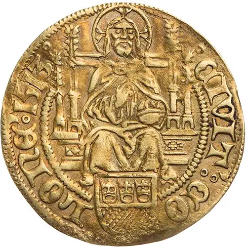 | Obverse description | Christ sits enthroned facing in Gothic stalls, city arms below. |