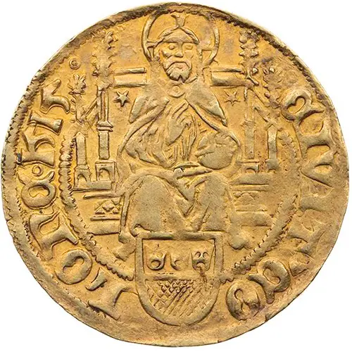 | Obverse description | Christ enthroned from the front in Gothic stalls over city arms, on the back wall of the throne above a five-pointed star to the sides of the shoulders. |