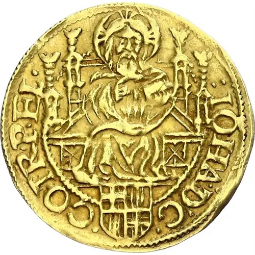 | Obverse description | Christ facing, seated on throne, small shield of 4-fold arms of Trier and Leyen at feet, titles of Johann VI. |