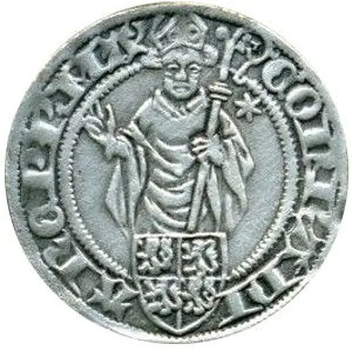 | Obverse description | Standing bishop with mitre, holding out the right hand and holding a crozier in the left, star to the right. Shielded arms at bottom within legend. |